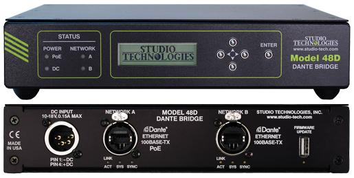 SKOKIE, IL, 25 OCTOBER 2018 – Studio Technologies, manufacturer of high-quality audio, video, and fiber-optic solutions, introduces the Model 48D Dante Bridge, which offers a simple to use, high performance means of sending and receiving audio signals between two independent local area networks (LANs). Users can interconnect up to four Dante® audio channels in each direction with full isolation and preservation of network security. The Model 48D is compliant with Dante Domain Manager (DDM) and supports AES67 digital audio signals.