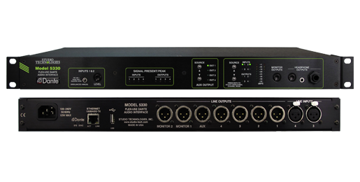 SKOKIE, IL, 15 NOVEMBER 2018 – Studio Technologies, manufacturer of high-quality audio, video, and fiber-optic solutions, introduces the Model 5330 Flex-Use Dante Audio Interface, a simple yet high-performance means of interfacing analog signals with applications that utilize Dante® audio-over-Ethernet media networking technology. Four line-level analog sources can be connected to the unit and then, after conversion to digital, output by way of four output (transmitter) channels associated with the Dante interface.