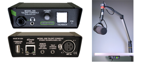 SKOKIE, IL, 22 SEPTEMBER 2021 – Studio Technologies, manufacturer of high-quality audio, video, and fiber-optic solutions, presents the Model 209 Talent Console. Featuring a unique combination of microphone input, headphone output, remote control, and tally-output resources, the Model 209 is designed for a variety of podcast, voiceover rooms, and fixed/REMI broadcast applications. The unit supports AES67 and Dante® Audio-over-Ethernet technology for integration into contemporary applications, as well as being compatible with Audinate’s Dante Domain Manager™ software application.