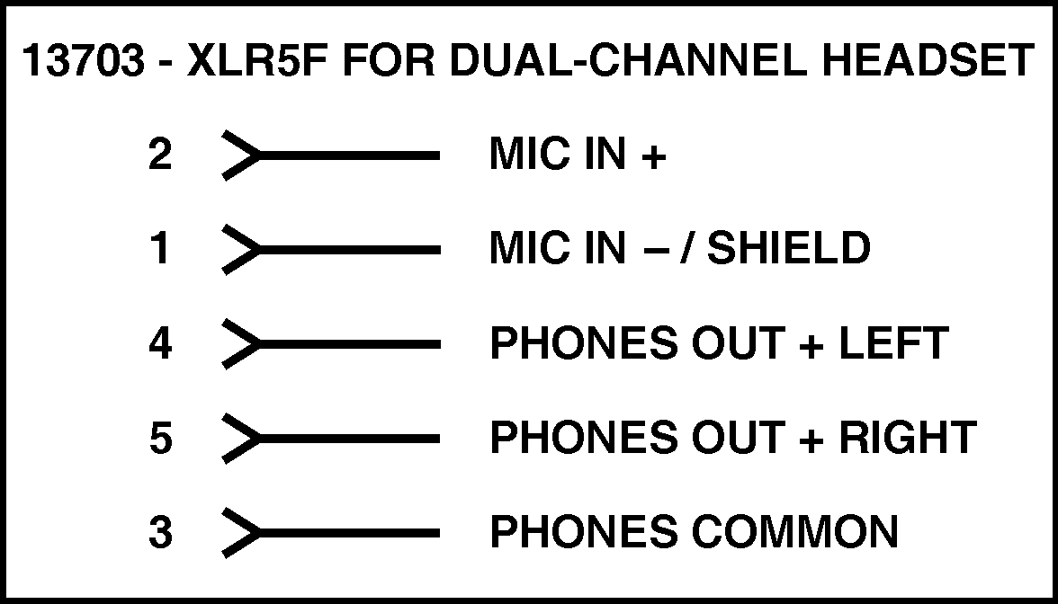Allows a technician to add a 5-pin female XLR connector. Provides support for headsets that use a 5-pin plug for unbalanced microphone and dual earpiece connections. Installs in one of the back-panel spare-connector locations. To support single-channel headsets refer to the 5-Pin Single-Channel Headset Connector Assembly (Order Code: 13579).