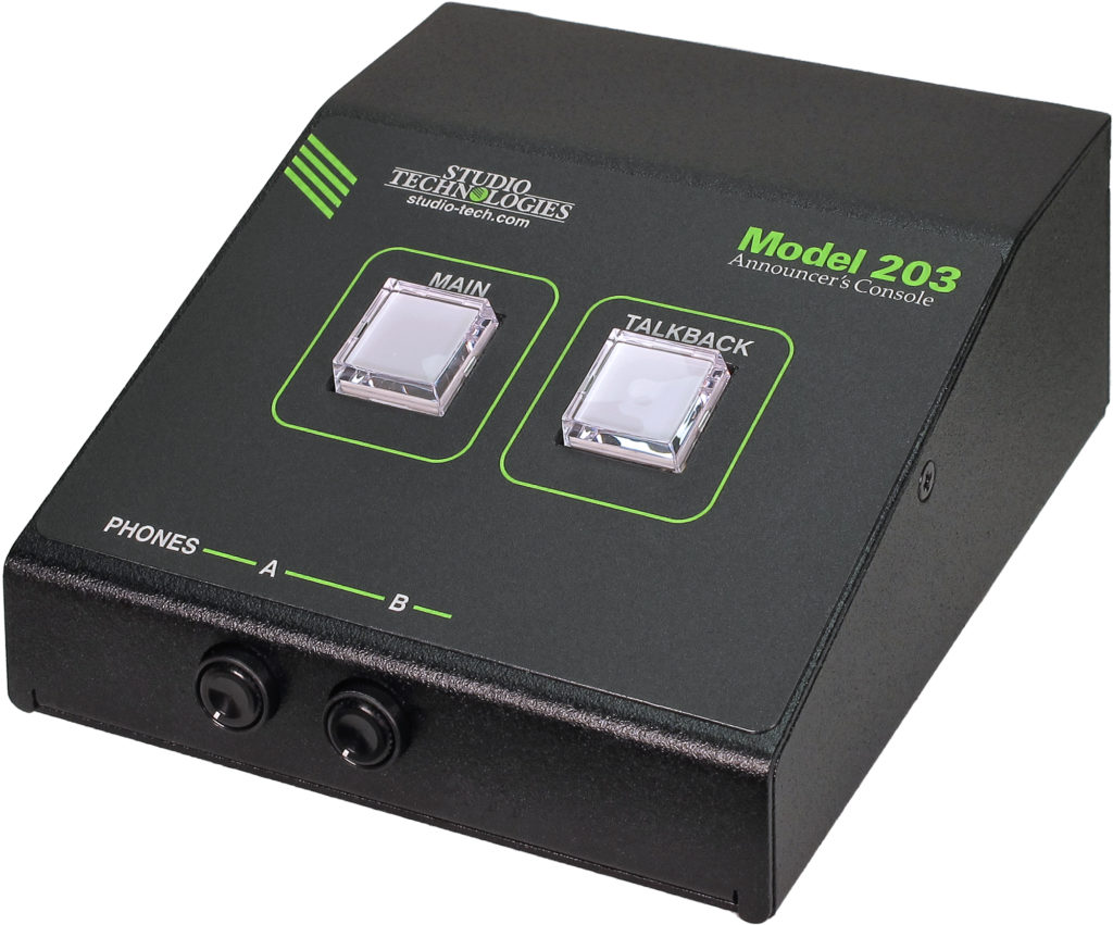 The Model 203 Announcer's Console offers the audio resources needed to directly support a complete broadcast on-air position. Using Dante® audio-over-Ethernet technology, the unit provides main and talkback output channels, talent cue (IFB) inputs, and sidetone capabilities. Housed in a compact, desktop package, it offers users a combination of the essential buttons and controls along with a range of important operating features. The Model 203 is compatible with the Dante Domain Manager™ (DDM) software application and is AES67-compliant for integration into many contemporary networked audio applications.