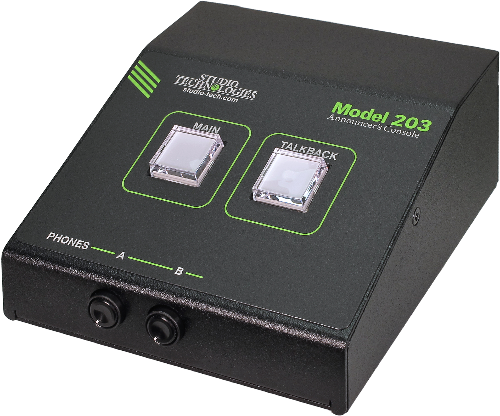 The STcontroller software application is used to configure a wide range of Model 203 operating parameters. This allows the unit's performance to be optimized to meet the needs of specific applications. The user is presented with two pushbutton switches and two push-in/push-out rotary potentiometers ("pots"). This makes it easy to control the status of the main and talkback outputs as well as adjusting the level of the talent cue audio signals as they are sent to the headphone output channels.