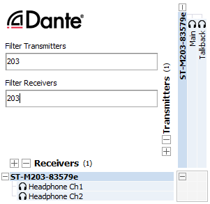 Audio data is sent to and received from the Model 203 using the Dante audio-over-Ethernet media networking technology. The Model 203's two Dante transmitter (output) and two Dante receiver (input) audio channels can be assigned to other devices (routed) using the Dante Controller software application. The Dante transmitter (output) and receiver (input) channels are limited to supporting four Dante flows, two in each direction. The digital audio's bit depth is up to 24 with supported sample rates of 44.1, 48, 88.2, or 96 kHz. Two bi-color LEDs provide an indication of the Dante connection status.