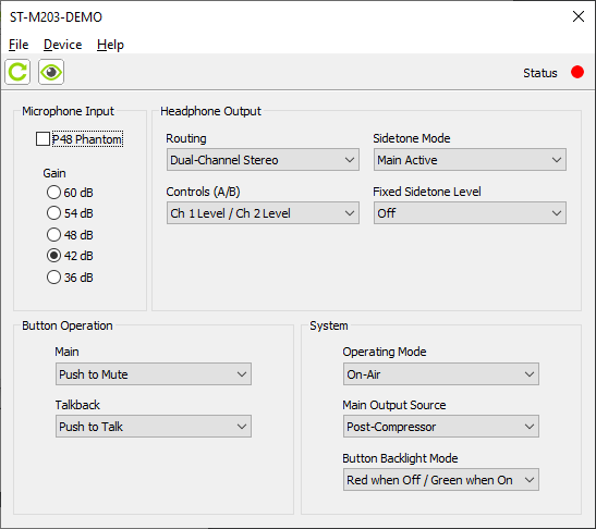The Model 203 can be configured to meet the needs of specific applications and user preferences. All configuration tasks are performed using the STcontroller personal computer software application which is available free of charge on the Studio Technologies' website. (Versions of STcontroller that are compatible with the Windows® and macOS® operating systems can be downloaded.) In the Model 203 there are no mechanical switch settings or button-press sequences required to configure how the unit functions. Selectable parameters include microphone preamplifier gain, P48 phantom power on/off, headphone output performance, sidetone operation, button operation, and main output audio source.