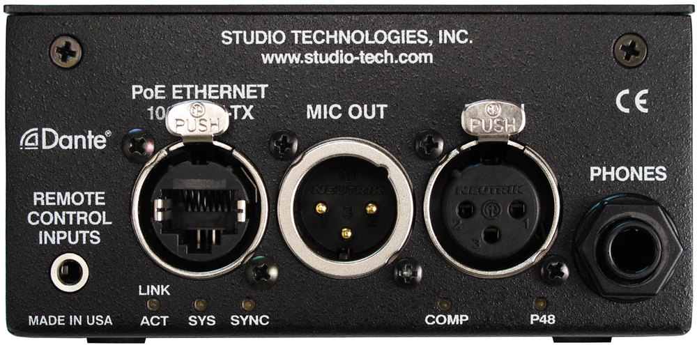 The Model 206 integrates directly into both Dante audio-over-Ethernet and standard analog audio environments. With just a Power-over-Ethernet (PoE) connection, a microphone, and a pair of headphones or an earpiece, a complete broadcast on-air position can be created. And by using the Model 206's microphone output a direct connection to an analog microphone-level input on an associated camera, remote I/O interface, or audio console can be supported. Two remote control inputs allow external switches or contact closures to activate the main and talkback button functions. One of the inputs can also be configured to provide a low-voltage DC "tally" output that follows the state of the main output.