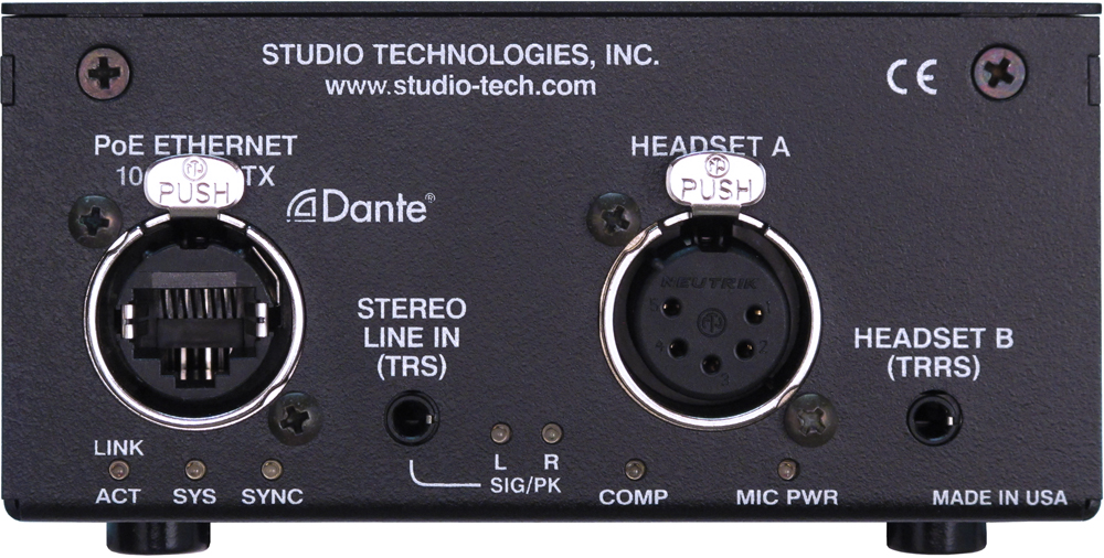 The Model 207 integrates directly into both Dante audio-over-Ethernet and standard analog audio environments. With just a Power-over-Ethernet (PoE) connection, a broadcast or "gaming" headset, and a connection to a stereo line-level audio source, a complete player position can be created.