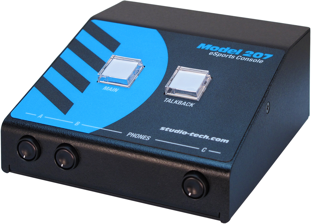 The Model 207 eSports Console offers a unique combination of analog and digital audio resources specifically intended to support eSports-related live event, entertainment, and streaming broadcast applications. The unit is housed in a compact, rugged steel enclosure that's intended for table-top use. Its diminutive size also makes it ideal for use in space-constrained locations. Blue LED lights cast a distinctive "underglow" from the bottom of the enclosure. The Model 207 supports Dante® audio-over-Ethernet digital media technology with AES67 compatibility for integration into contemporary applications. The unit is extremely simple to deploy, is "pro" quality throughout, and provides an intuitive user experience. The Model 207's audio quality is excellent, with low distortion, low noise, and ample headroom. Careful circuit design and rugged components ensure long, reliable operation.