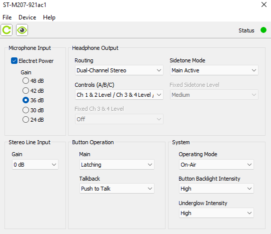 The Model 207 can be configured to meet the needs of specific applications and user preferences. All configuration choices are performed using the STcontroller software application. Selectable parameters include microphone preamplifier gain, microphone power source on/off, button operation, headphone source routing and control operation, sidetone operation, and overall unit operation. In addition, the intensity of the LED indicators can be configured as desired. The gain of the microphone preamplifier can be selected from among five choices. This allows the Model 207 to match the output sensitivity of a range of headset-associated microphones. A source of low-voltage DC power can be enabled if required to support electret microphones.