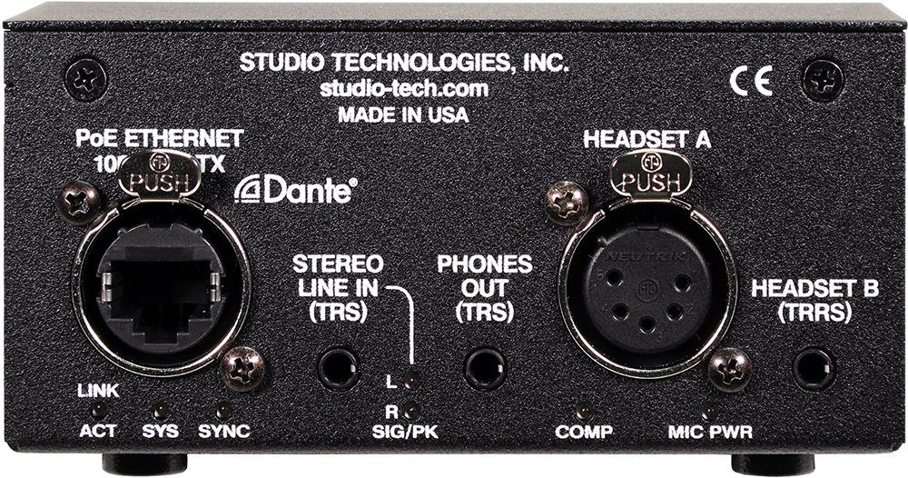 The Model 207A integrates directly into both Dante audio-over-Ethernet and standard analog audio environments. With just a Power-over-Ethernet (PoE) connection, a broadcast or "gaming" headset, and a connection to a stereo line-level audio source, a complete player position can be created. If support for audio masking is desired, a set of stereo earbuds can also be connected.
