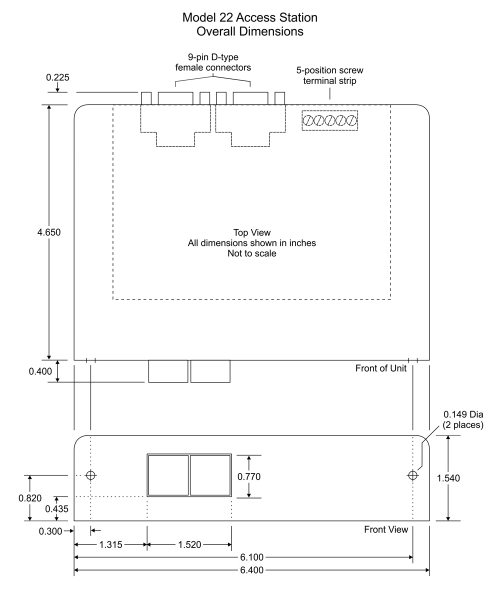 Two DE-9F (9-pin D-subminiature female) connectors. One connector intended to link Model 22 to Model 2A Central Controller. The second connector, wired in parallel with the first, is designed to allow "loop through" installation for connection to additional Model 22(s).