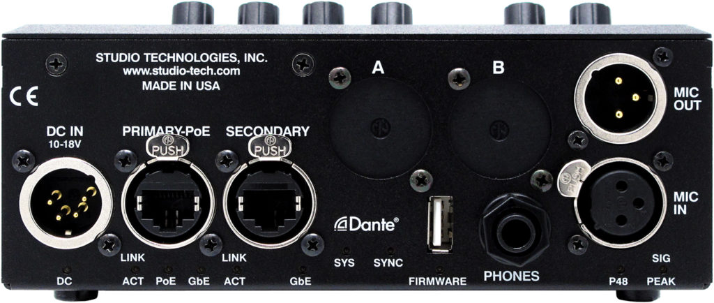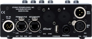 The output of the microphone preamplifier is routed to an analog-to-digital conversion (ADC) section that supports sampling rates of 48 and 96 kHz. The audio signal, now in the digital domain, routes through a 32-bit microprocessor and associated programmable logic and then on to the Dante interface section where it is packetized and prepared for transport over Ethernet. Six Dante transmitter (output) channels are provided: one main, one aux, two talkback, and two headphone monitor output channels.