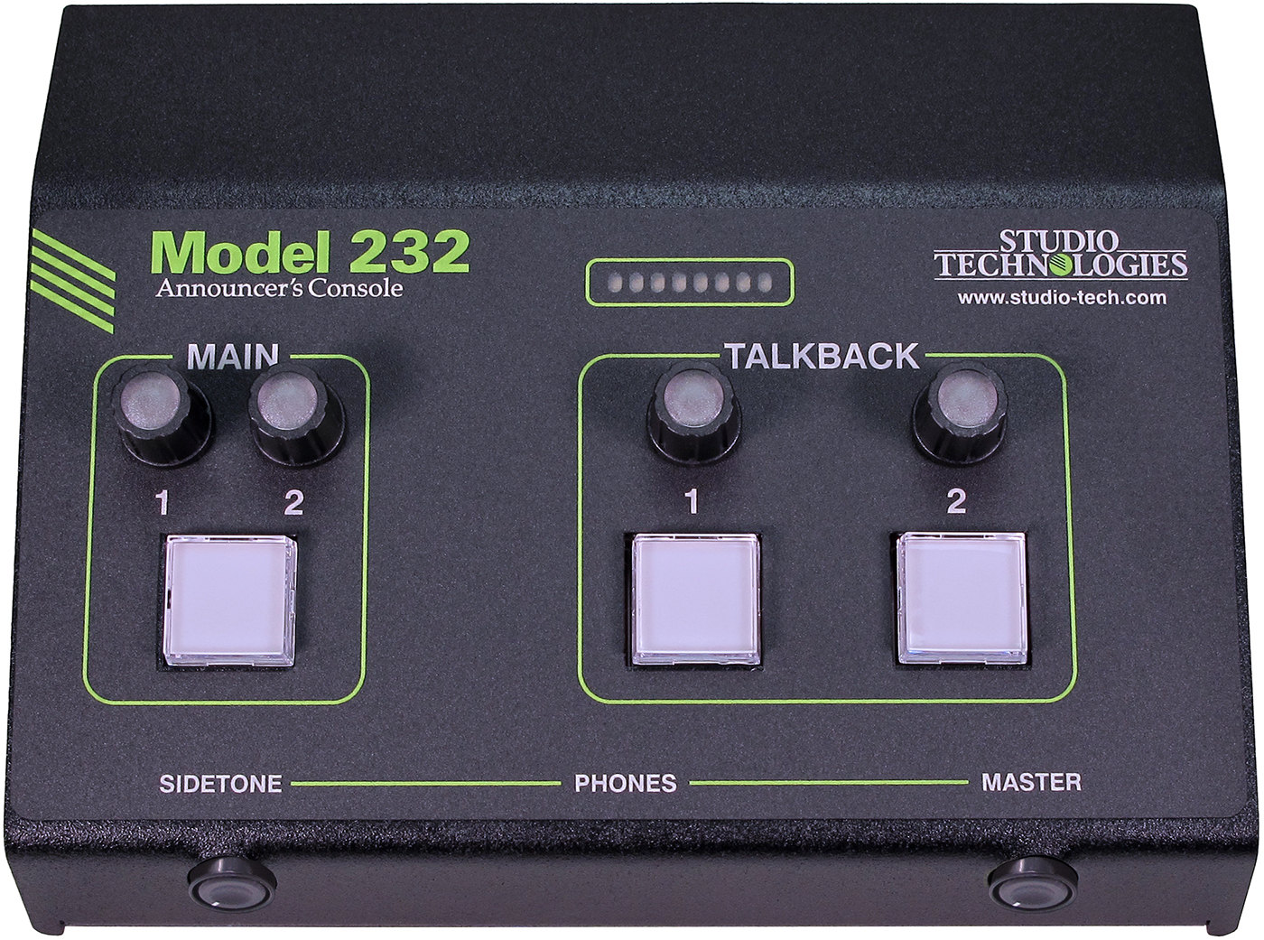 The amount of flexibility provided in the Model 232 allows it to meet the needs of virtually all on-air announcer applications. And using the Studio Technologies' STcontroller software application makes "customizing" the operation of a Model 232 fast and simple. The unit's ability to handle both day-to-day and specialized situations makes it a unique product in the market. For example, the pushbutton switches and rotary encoders can be independently configured with multiple choices that range from simple to quite advanced. If a Model 232 can't seem to be configured to meet an application's goals please contact Studio Technologies' technical support for an application review.