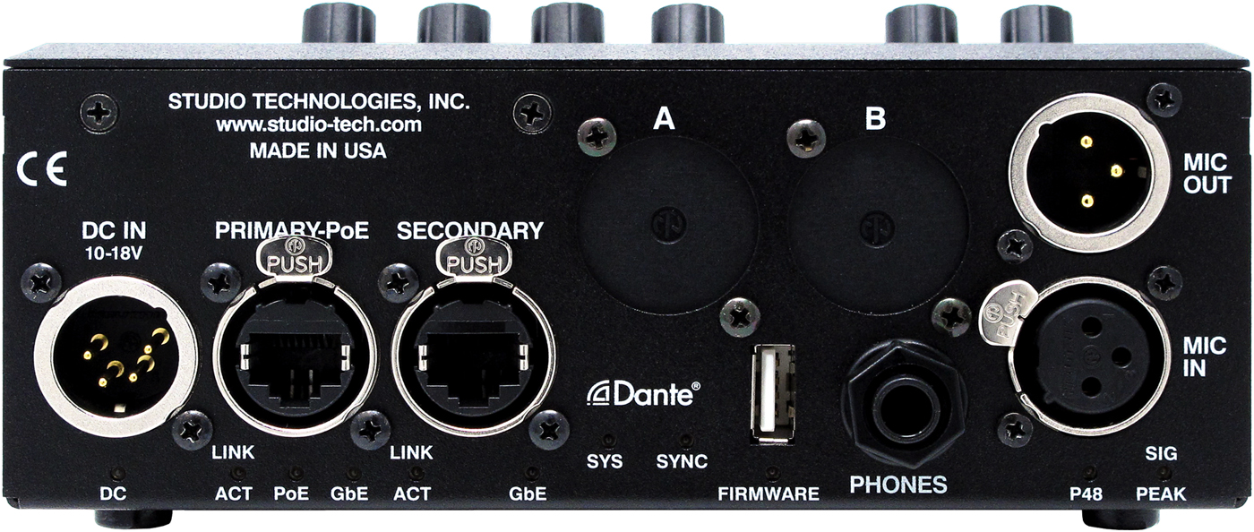 The output of the microphone preamplifier is routed to an analog-to-digital conversion (ADC) section that supports sampling rates of 48 and 96 kHz. The audio signal, now in the digital domain, routes through a 32-bit microprocessor and associated programmable logic and then on to the Dante interface section where it is packetized and prepared for transport over Ethernet. Ten Dante transmitter (output) channels are provided: one main, one aux, six talkback, and two headphone monitor output channels.