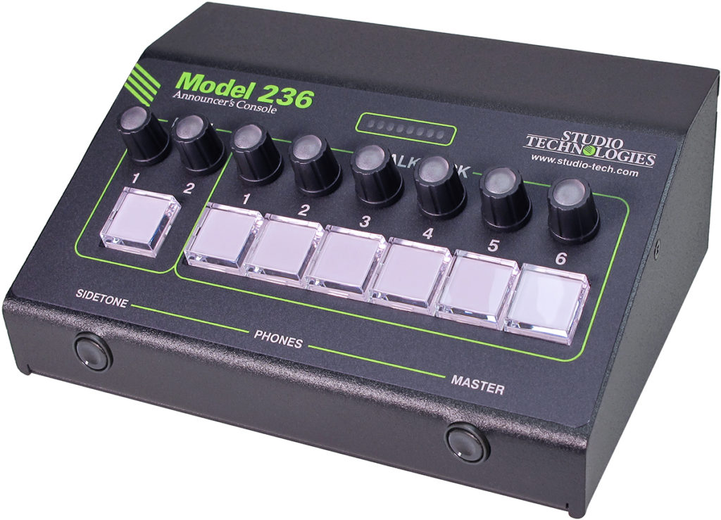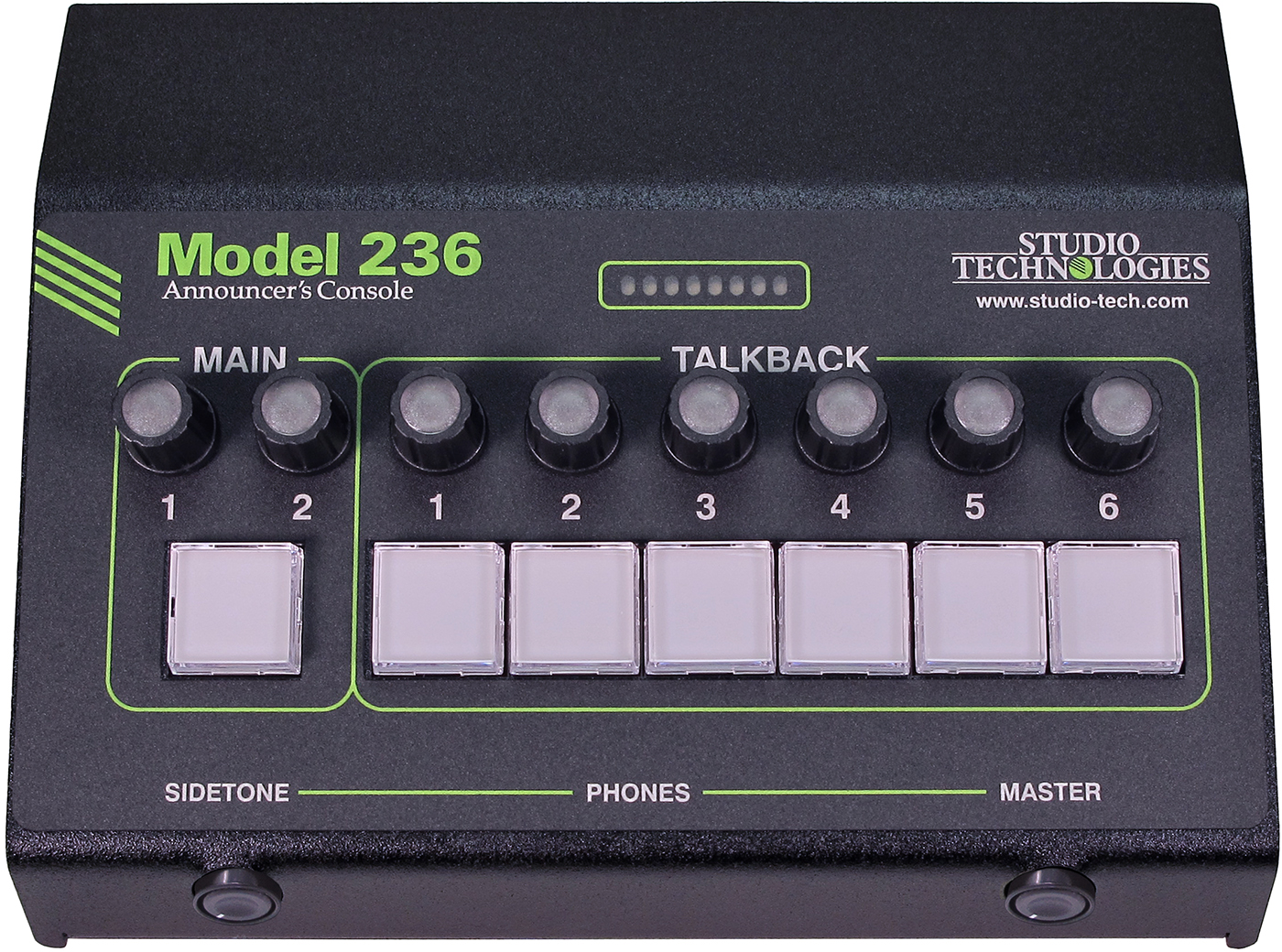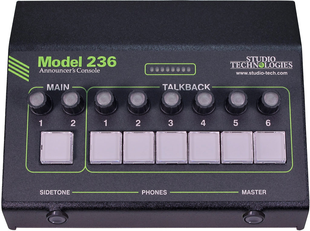 The amount of flexibility provided in the Model 236 allows it to meet the needs of virtually all on-air announcer applications. And using the Studio Technologies' STcontroller software application makes "customizing" the operation of a Model 236 fast and simple. The unit's ability to handle both day-to-day and specialized situations makes it a unique product in the market. For example, the pushbutton switches and rotary encoders can be independently configured with multiple choices that range from simple to quite advanced. If a Model 236 can't seem to be configured to meet an application's goals please contact Studio Technologies' technical support for an application review.