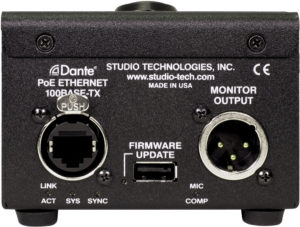 The user is presented with four pushbutton switches and a push-in/push-out rotary level potentiometer. The pushbutton switches are lighted with dual-color LEDs to clearly present the unit's operating status. The monitor output (available in both analog and Dante digital formats) can assist the user in confirming the current audio operation.