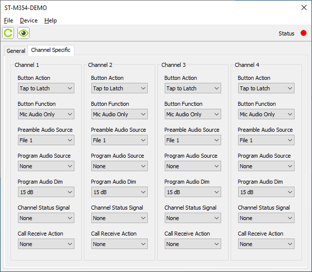A Model 354 function allows high-frequency "call" audio signals present in a Dante receiver (input) channel to be detected and displayed in the LED indicators associated with a pushbutton switch. This allows users to observe the on or off status of call signals that may be associated with intercom audio channels. In addition, this function can be used to display when a channel is active. This allows multiple Model 354 units to be deployed in a single application, with each unit displaying the talk status of all the others. A configuration option allows an associated pushbutton switch to be disabled whenever talk activity is taking place in other units. This feature will help prevent multiple users from simultaneously activating a talk function.