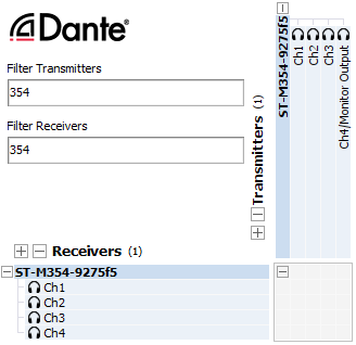 Audio data is sent to and received from the Model 354 using the Dante audio-over-Ethernet media networking technology. As a Dante-compliant device, the Model 354's four Dante transmitter (output) channels and four Dante receiver (input) channels can be assigned (routed or "subscribed") to other devices using the Dante Controller software application. The Dante transmitter (output) and receiver (input) channels are limited to supporting four Dante flows, two in each direction. The digital audio's bit depth is up to 32 with a sampling rate of 48 kHz. Two bi-color LEDs provide an indication of the Dante connection status. An additional LED displays the status of the associated Ethernet connection.