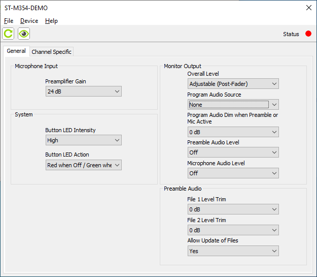 The Model 354 can easily be configured to meet the needs of many specific applications and user preferences. All configuration choices are performed using the STcontroller software application. Versions of STcontroller are available to support the WinOS® and macOS® operating systems. Selectable configurable parameters include microphone preamplifier gain, WAV file level trim, LED