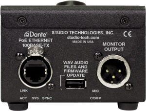 The Model 354A can easily be configured to meet the needs of many specific applications and user preferences. All configuration choices are performed using the STcontroller software application. Versions of STcontroller are available to support the WinOS® and macOS® operating systems. Selectable configurable parameters include microphone preamplifier gain, WAV file level trim, LED indicator intensity and actions, and monitor output source selection and operation. In addition, each of the four Dante transmitter (output) functions can be optimized from the six available configuration choices. These choices allow the unit to be configured to support voice page, talent cueing (IFB), and other specialized applications.