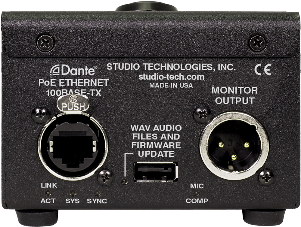 Set up, configuration, and operation of the Model 354A is simple. An RJ45 jack is used to interconnect with a standard twisted-pair Ethernet port associated with a PoE-enabled network switch. This connection provides both power and bidirectional digital audio. A gooseneck microphone is attached using the 3-conductor ¼-inch jack with integrated threaded bushing. The Studio Technologies' GME-3-12 Gooseneck Microphone is available as an option and will perform very well with the Model 354A.