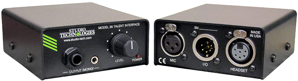 The Model 36 Talent Interface is a combination self-contained headset/earpiece amplifier and microphone routing module. Headset connector can be either 5-pin, 6-pin, or 7-pin XLR. The unit is powered by a standard IFB circuit, including those provided by Studio Technologies' Model 41 or Model 42A Interfaces. The Model 36 is compatible with Live-Link™ Remote Camera Interface Systems.