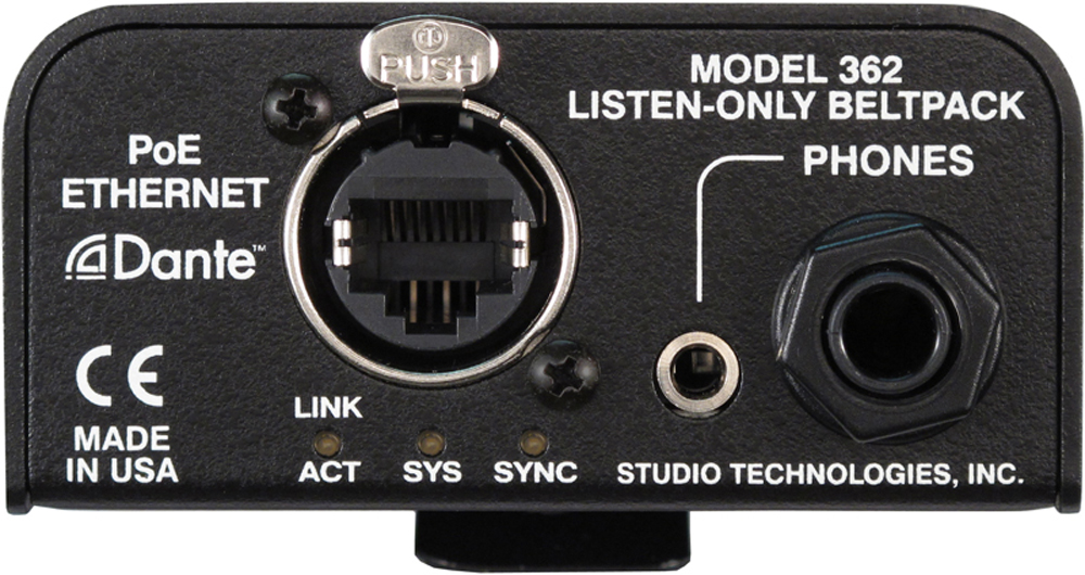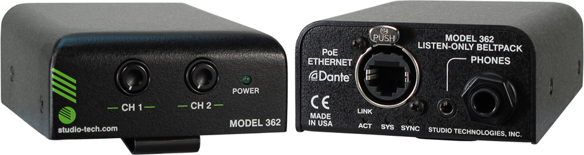 The Model 362 Listen-Only Beltpack is a self-contained 2-channel user device that supports headphone monitoring of two audio channels associated with the Dante® audio-over-Ethernet media networking technology. Each Model 362 is intended to be used by one user, providing them with the form factor, reliability, and features needed to be effective in a variety of applications. It's expected that most applications will use multiple Model 362 units to support the individual audio monitoring needs of a group of users.