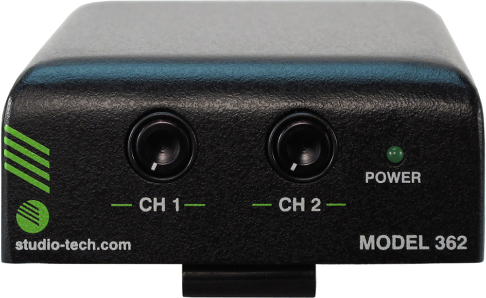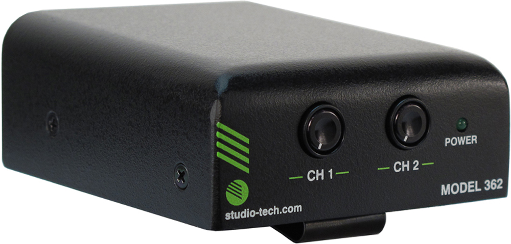Two "push-in/push-out" rotary potentiometers ("pots") make it easy for the user to set and maintain the desired level on the 2-channel headphone output. Four LEDs provide a clear and complete indication of the unit's operating status. The Model 362's enclosure is made from an aluminum alloy which offers both ruggedness and light weight. A stainless steel "belt clip," located on the back of the unit, allows direct attachment to a user's clothing.
