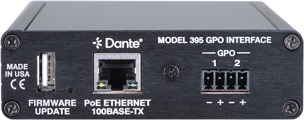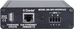 The Model 395 GPO Interface supports two general-purpose output (GPO) signals for a range of applications. The unit is housed in a lightweight, aluminum, tabletop enclosure. A 100BASE-TX (100 Mb/s) Ethernet interface is used to provide both data and Power-over-Ethernet (PoE) power. Utilizes DanteĀ® audio-over-Ethernet media networking technology and is configured using the STcontroller application.