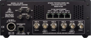 The Model 412 Fiber Transport System is a half-rack, "2U" high unit that is intended for portable or fixed broadcast and related applications. Energy efficient, the Model 412 requires little power for operation and runs "cool" to the touch. Units are factory configured from among three available choices. All versions contain identical Ethernet support capabilities but differ in their SDI/MADI transport offerings. The Model 412-6T/E serves as a 6-channel electrical-to-optical (E2O) converter, allowing connection of up to six SDI or MADI signals by way of standard BNC connectors. The six channels are converted to optical and multiplexed onto two single-mode fibers; three complete SDI or MADI signals are carried per fiber. The Model 412-6R/E is a 6-channel optical-to-electrical (O2E) converter. Two optical fibers bring the multiplexed signals into the unit which converts them into six electrical SDI or MADI outputs on BNC connectors. For "transceiver" applications the Model 412-3T/3R/E provides three channels of electrical-to-optical (E2O) and three channels of optical-to-electrical (O2E) conversion. Three BNC connectors are used to interface with three SDI/MADI sources and another three BNC connectors provide the SDI/MADI outputs.