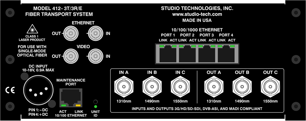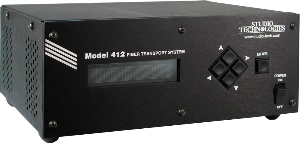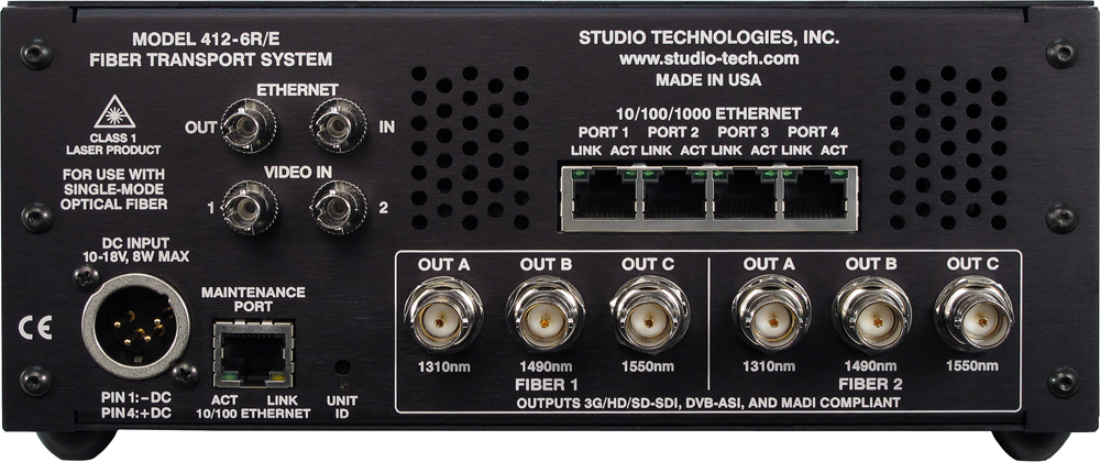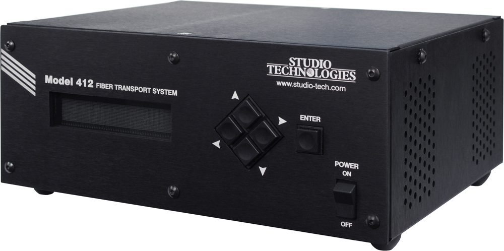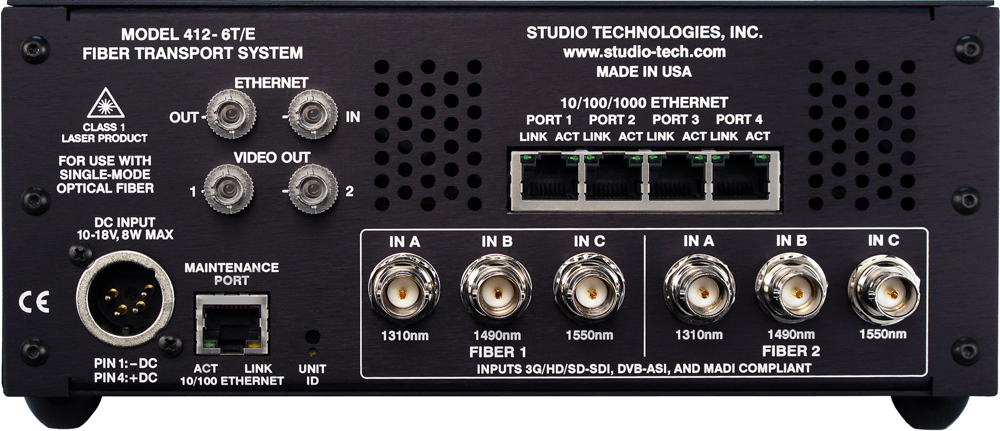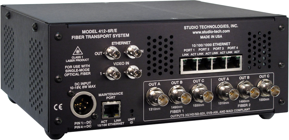 The Model 412 uses a novel hardware implementation to transport three SDI or MADI signals over each of two single-mode optical fibers. The three SDI or MADI signals, at rates of up to 2.97 Gb/s, are transported over one fiber at wavelengths of 1310, 1490, and 1550 nm. In typical applications the launch power and receive sensitivity are such that signals can be transported over a minimum distance of 10 kilometers.