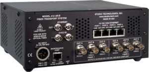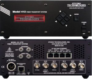 The front panel of each Model 412 version features a day/night-readable color backlit display, menu navigation buttons, and power on/off switch. The back panels include connections for DC power, four ST optical connectors, six BNC connectors for SDI/MADI signals, four RJ45 jacks associated with the Ethernet switch functions, and an RJ45 jack for connection with the Ethernet monitor interface.