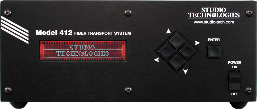 The Model 412's front-panel status screen lets users or technicians observe the status of SDI/MADI input and output channels. Information provided includes optical transmit and receive levels as well as the type of signals being transported. Ethernet-related functions such as link status and optical transmit and receive power are also provided. Optical signal levels are reported directly in dBm, making it particularly useful in conjunction when remote system troubleshooting.