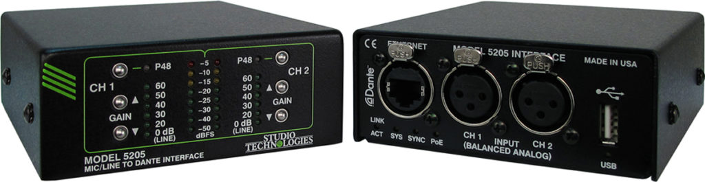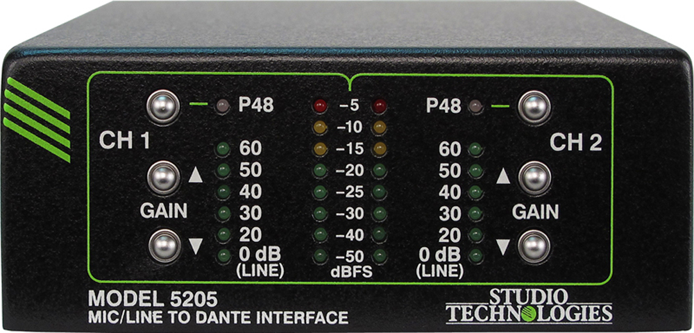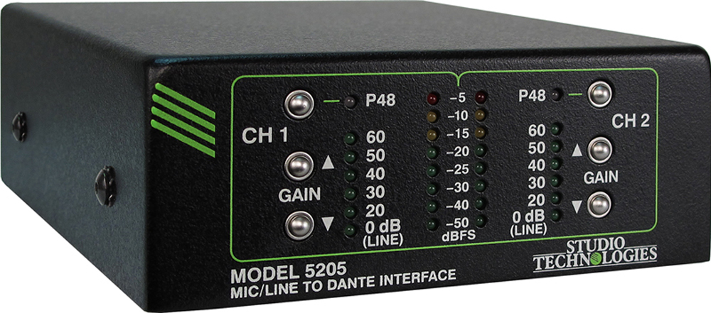The Model 5205 Mic/Line to Dante Interface is a general-purpose audio device that supports applications utilizing the DanteĀ® audio-over-Ethernet media networking technology. Two analog microphone or line-level audio signals can be connected to the Model 5205. They are amplified as required and then converted to digital audio channels on an associated Dante connection. With the inherent interoperability of Dante, the Model 5205 can be used with other Studio Technologies Dante-enabled products or a multitude of devices from many other manufacturers.