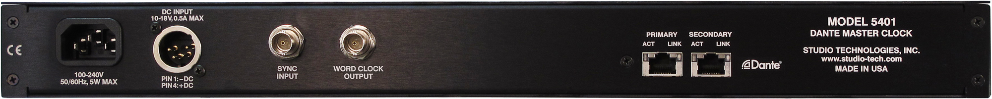 The Model 5401 is suitable for use in fixed and mobile broadcast facilities, post-production studios, commercial and educational theater environments, and entertainment applications. Only power and one or two Ethernet network connections are required for full operation. Using Dante’s inherent capabilities two Model 5401 units can serve in primary and secondary master clock roles for redundant operation.