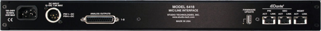 The Model 5418 Mic/Line Interface provides a simple yet high-performance means of interfacing analog signals with applications that utilize DanteĀ® audio-over-Ethernet media networking technology. Eight analog microphone- or line-level sources can be connected to the unit and then output in the digital domain by way of a Dante interface. Eight digital audio signals, which arrive by way of Dante, are converted to analog and then output as balanced line-level signals. Configuration choices also allow other audio signals to be selected as the sources for the analog output channels. A monitor section allows the input and output signals to be selectively observed using meters and a headphone output.