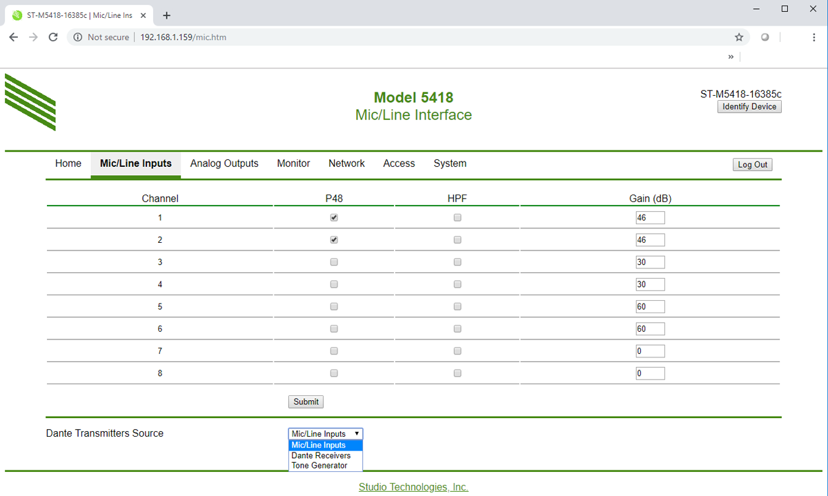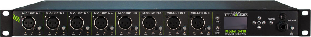 The Model 5418 is a fully professional product that offers the audio quality, features, and reliability required by 24-hour on-air and commercial applications. Located on the unit's front panel, the eight mic/line audio inputs use standard 3-pin female XLR connectors for easy interfacing with balanced and unbalanced sources. The input circuitry features adjustable gain, P48 phantom power, and high-pass filter functions. Configuration of the inputs can be made locally by using pushbutton switches and an OLED display. Alternately, the STcontroller software application allows remote control of the input parameters. The analog mic/line input audio signals are converted to 24-bit PCM digital and then transported via the Dante interface.