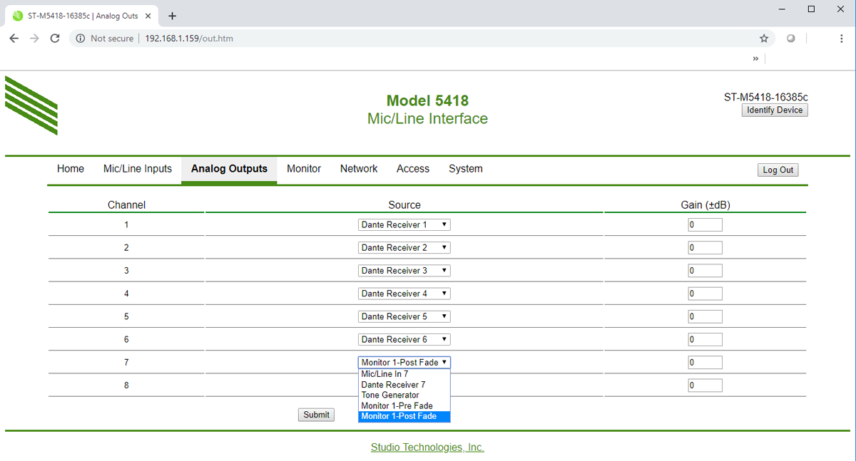 The Model 5418 provides eight general-purpose line-level analog output channels. Each of the analog output channels can be individually configured to use as its input source a Dante receiver (input) channel, a mic/line input channel, one of the monitor output channels, or a 1 kHz sine-wave tone. In most applications, a receiver (input) channel associated with the unit's Dante interface will serve as the audio source. The Dante Controller software application would be used to select the source which originates from a transmitter (output) channel on an associated piece of Dante equipment.