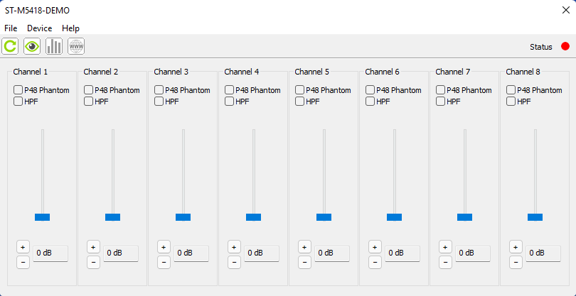 Remote Configuration Capability: preamplifier gain, P48 phantom power on/off status, and high-pass filter (HPF) on/off status (uses STcontroller software application)