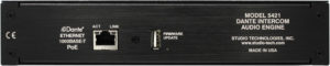 The Model 5421 is compatible with many Dante-compliant devices including the extensive range of intercom beltpacks from Studio Technologies. These include the single-channel/dual-listen Model 372A and Model 373A, the 2-channel Model 370A and Model 371A, and the 4-channel Model 374A. The Model 5421 will also function directly with other Dante-supporting devices such as the Model 348 Intercom Station and Model 391 Dante Alerting Unit. In addition, the Model 5421 can function with matrix intercom systems, audio consoles, and wireless intercom base stations.