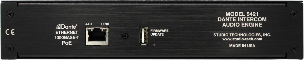 Only a Gigabit Ethernet network connection with Power-over-Ethernet (PoE) support is required for the Model 5421 to provide a powerful resource in a variety of Dante applications. Front- and back-panel LEDs provide operating status indications. The Studio Technologies' STcontroller software application allows personnel to view and configure key operating parameters. The unit's lightweight "1/2-rack" enclosure can be used stand-alone or mounted in one space (1U) of a standard 19-inch rack enclosure with an optional installation kit. To meet the latest interoperability standard the Model 5421's Dante implementation meets the requirements of AES67 as well as supporting the Dante Domain Manager™ (DDM) software application. Using DDM, compliance with ST 2110-30 may be possible.