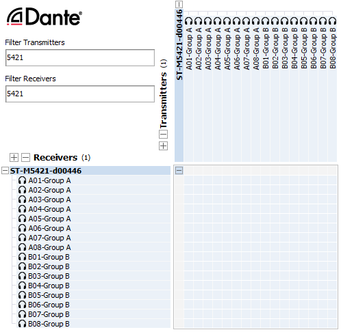 From the factory, the Model 5421 will assign a unique, although somewhat-generic name (Dante label) to each group. However, using the Dante Controller application the name of each group can be edited as desired. A revised label would typically reflect how the specific group is going to be utilized. Labels such as Camera PL, Lighting, Pyro, IFB Mix, or Engineering would typically be used in broadcast- or live-event-oriented intercom applications. The configured labels are automatically used by the Model 5421's Dante interface and can provide clarity when routing Dante channels using applications such as Dante Controller. Each group label can be a combination of up to 14 alpha or numeric characters. Channel numbers are automatically appended to the entered labels to provide identification of the specific channels within the Dante environment. A label of up to 12 additional characters can also be added to each specific group channel, providing further details about an application.
