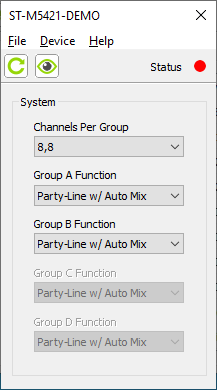 The 16 channels offered by the Model 5421 are configured into what are called groups. Simple configuration choices are accessed using the STcontroller software application and allow the number of groups and their sizes to be selected. Group configuration can range from one group having 16 channels (a complete audio engine being used for a single group) to four groups each having four channels. The size of a group will dictate how many devices and associated users can be part of any one party-line. Five choices allow a range of group configurations to be selected with the default setting being two 8-channel groups.