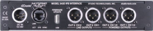 A Model 543D can utilize up to four digital audio input channels provided by Dante-enabled devices such as matrix intercom systems, DSP processors, broadcast routers, and audio consoles. The unit's powered IFB outputs allow direct connection with listen-only user beltpacks such as the Studio Technologies' Model 32A, Model 33A, or Model 34. The powered IFB outputs also support connection of listen-only devices from manufacturers such as RTS® and Clear-Com®. Two LED indicators serve as status displays for the 28 volts DC that is an integral part of each powered IFB output. The two line-level IFB outputs are provided for connection with a variety of devices that have balanced or unbalanced analog inputs.