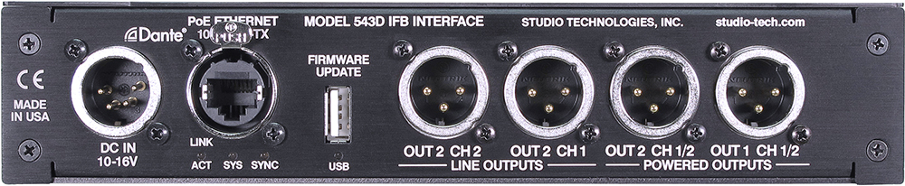 Dante audio-over-Ethernet technology is used to transport four audio channels from their source to the Model 543D and then on to the two, 2-channel IFB outputs. Each of the Model 543D's powered IFB outputs supplies DC voltage and two audio channels to groups of listen-only user devices. Two analog line-level IFB outputs are also provided for general-purpose use. The Model 543D is compatible with the latest broadcast and audio equipment that uses Dante technology. An Ethernet connection is all that’s required to make the Model 543D part of a sophisticated, networked audio system.