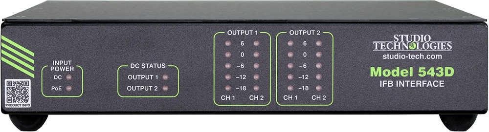 Four audio level meters, located on the unit's front panel, provide confirmation of system performance during setup and operation. Careful attention to circuit design and component selection ensures that excellent audio quality is maintained. The Model 543D's operating power can be provided either by a power-over-Ethernet (PoE) connection or an external source of 12 volts DC. Two front-panel LEDs display the status of the PoE and/or DC sources. Standard connectors are used for the powered and line-level IFB outputs, Ethernet, and DC power interconnections. The Model 543D's enclosure has a "1/2-rack" 1U form factor and weighs less than two pounds, making it well suited for use in portable applications. Alternately, using one of the optional installation kits, one or two Model 543D units can be mounted in a single space (1U) of a standard 19-inch rack enclosure.