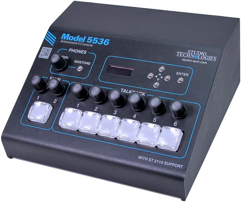 The Model 5536 Announcer's Console provides a combination of high-performance analog and digital audio capability with an extensive set of user features and configurable resources. The unit supports the SMPTE® ST 2110 suite of standards to implement audio-over-Ethernet networking connectivity. For enhanced network reliability, redundant stream performance, following the ST 2022-7 standard, is also supported. The Model 5536 is intended for use in demanding broadcast sports, eSports, live event, entertainment, and streaming broadcast applications. Requiring only minimal connections for deployment, the Model 5536 can provide one on-air talent with all the resources they need to support a wide range of applications. The compact, rugged enclosure is intended for tabletop use, small enough for use "court-side" or in a crowded booth, yet flexible enough for numerous remote production scenarios.