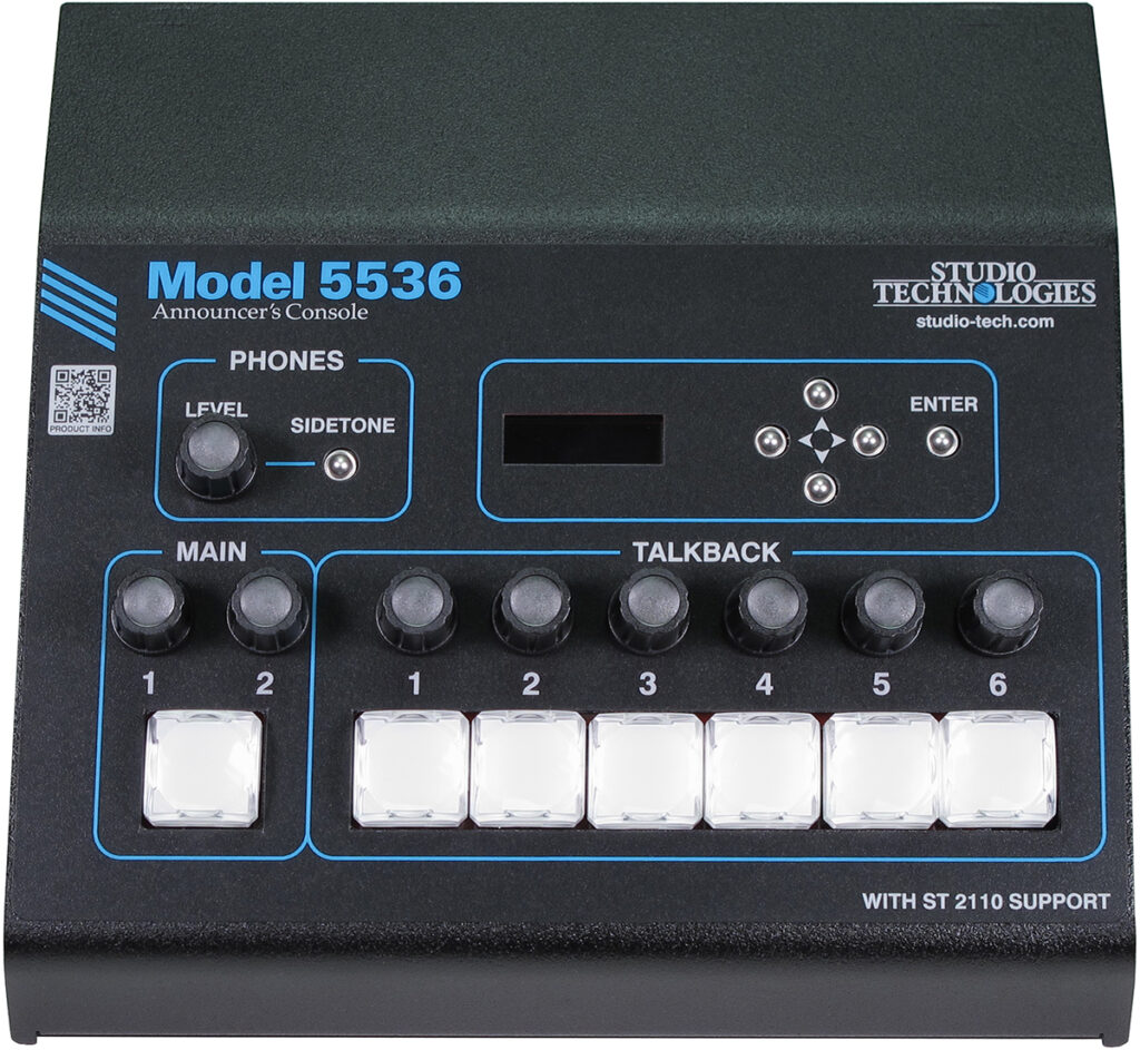 The amount of flexibility provided in the Model 5536 allows it to meet the needs of virtually all on-air announcer applications. Using a standard web browser makes "customizing" the operation of a Model 5536 fast and simple. The unit's ability to handle both day-to-day and specialized situations makes it a unique product in the market. For example, the pushbutton switches and rotary encoders can be independently configured with multiple choices that range from simple to quite advanced. If a Model 5536 can't seem to be configured to meet an application's goals, feel free to contact Studio Technologies' technical support for an application review. In most cases, the unit will be able to perform as needed. Once configured, users will find operation simple with little "guesswork" involved.