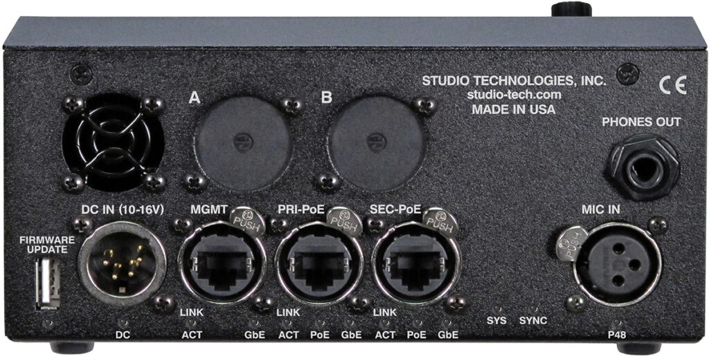 The Model 5536 integrates directly into ST 2110 environments. With just a PoE Ethernet (Power-over-Ethernet) Gigabit network connection, a microphone, and a pair of headphones, a complete broadcast on-air position can be created. With the addition of a second Ethernet connection, enhanced ST 2110 performance can be achieve using the ST 2022-7 Redundant Streams standard. An independent Gigabit network interface provides access to the Model 5536's management webpages. This allows full separation of audio transport and management functions.