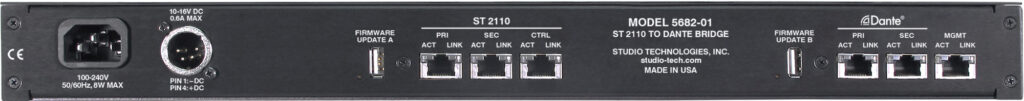 The suite of ST 2110 standards is finding wide-ranging use in broadcast applications. While also handling video and control signals, the Model 5682 is focused on ST 2110-compliant audio channels and their associated timing parameters. Dante audio-over-Ethernet has found acceptance in broadcast, audio/visual, and general audio applications due to its ease of use, excellent performance, strong interoperability, and wide adoption by many equipment manufacturers. However, interconnecting or bridging ST 2110 audio channels with Dante audio channels can present a challenge. Using the Model 5682 makes this a simple task, only requiring interconnecting standard Ethernet signals and performing a moderate amount of configuration.