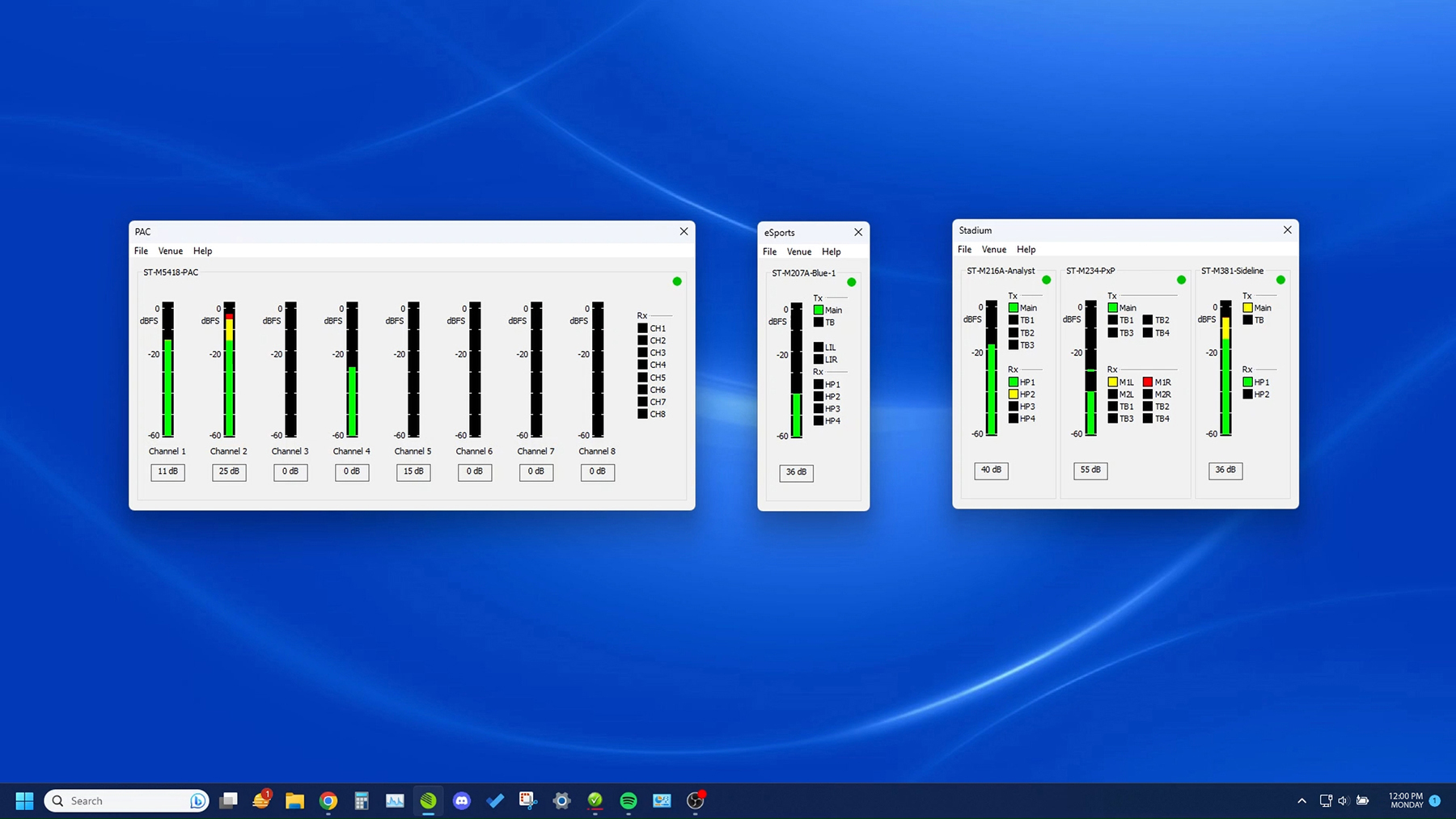Users can assign up to eight devices to each “venue” with multiple venues active at the same time. Each VenueView user has the ability to independently create their desired venues. This allows one user to view a set of devices on one PC, while another user can monitor the same devices, a completely different set of devices, or a combination of devices on a different PC. This offers a high level of flexibility for personnel monitoring audio onsite and at a remote location (the latter performance requires the use of other remote access software).